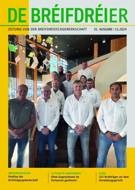 Editorial: Syndicat des P&T Klarer Gewinner der Sozialwahlen! Bréifdréieschkalenner: 100 Joer Mutualitéiten zu Lëtzebuerg Interview: Wirtschaftsminister Lex Delles